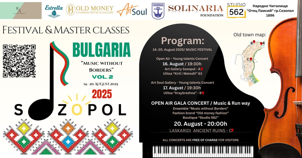 From August 14 to 20, the ancient town of Sozopol will become a stage for talent, inspiration, and new friendships. Music Without Borders invites you to masterclasses, an ensemble course, and three unforgettable open-air concerts: