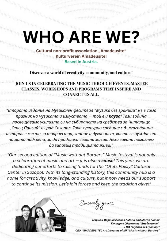 ✨ This year’s concerts have a cause – donations will be collected for the restoration of the National Chitalishte “Otets Paisiy” in Sozopol. Together, we can preserve the cultural heart of the town!