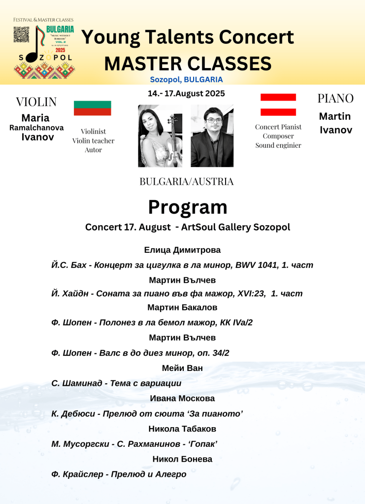 - August 17th: Concert and diploma ceremony for participants in the masterclasses at Art Soul Gallery in the evening.