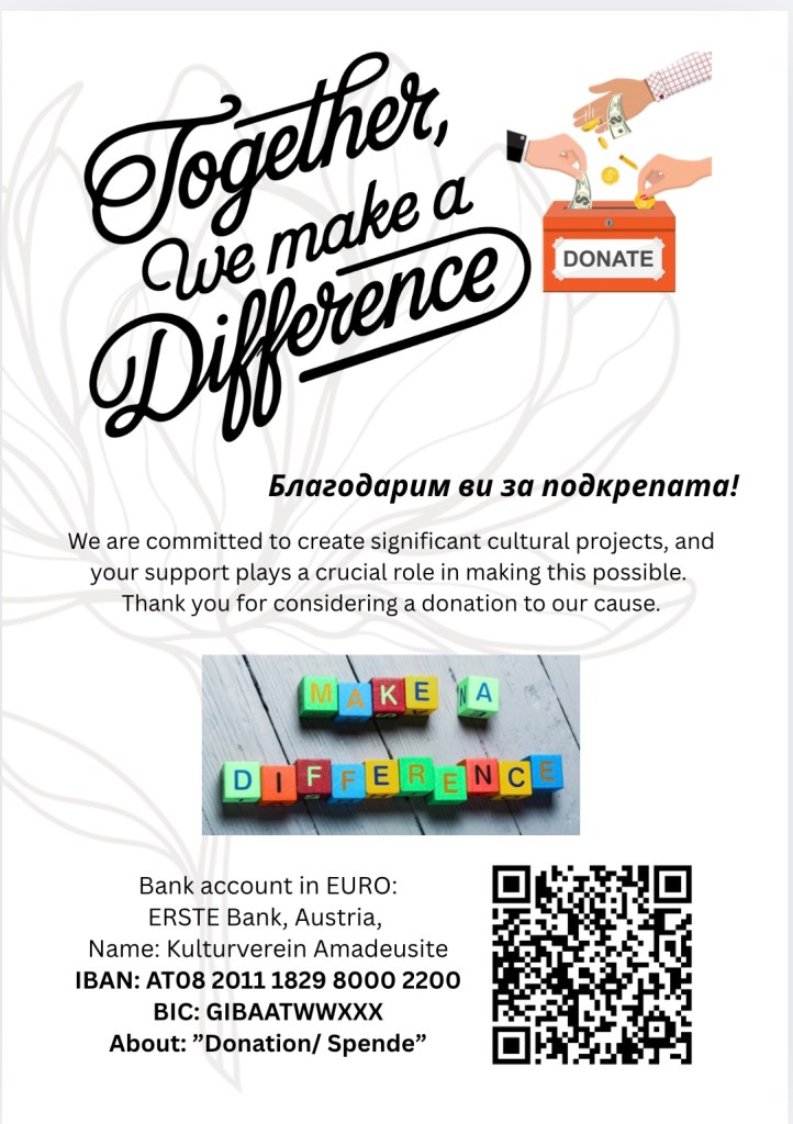 If you like our projects, feel free to make a donation to our bank account. Your contribution will help us continue our work and create more art and musical events. Every donation, no matter the size, is greatly appreciated and makes a meaningful impact on the progress of our projects.